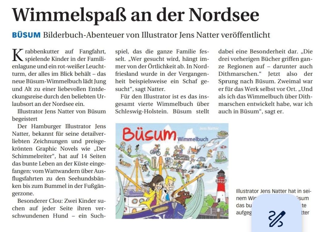 Das ging ja fix. Jonas Bargmann über das 1. Büsum Wimmelbuch in der Dithmarscher Landeszeitung. Hier ist das Buch erhältlich: https://www.boyens-buchverlag.de/neuerscheinungen/40574/wimmelbuch-buesum