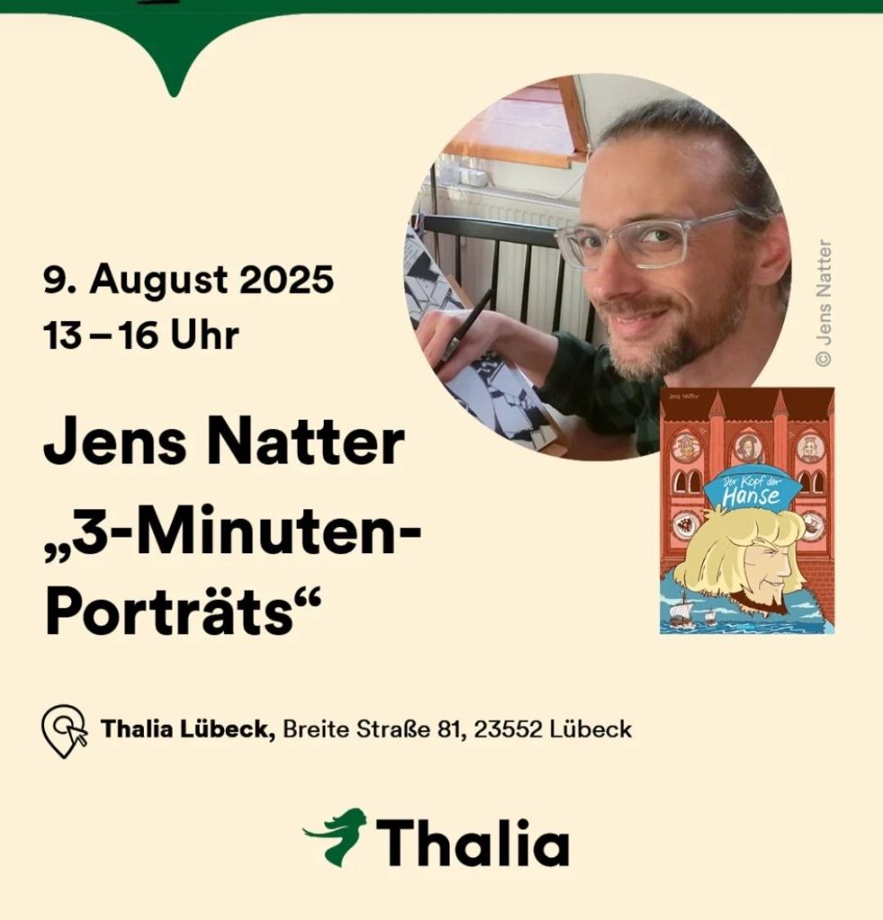 „Der Kopf der Hanse“ Signierstunde plus lustige 3 Min. Porträts gibt es am: – -2.8.25 bei der Hamburg Comic und Mangaconvention in der Fabrik in Altona.