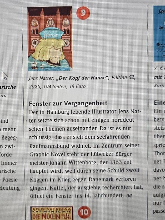 Der Zeichnerkollege Andreas Eikenroth (bekannt durch seine Büchner-Comicadaptionen) hat eine kurze , aber treffende Rezension über den „Kopf der Hanse“ in der aktuellen MARE-Ausgabe geschrieben.