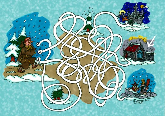 dem sei in den nächsten 60 sek. mit diesem Wegesuchspiel geholfen , dass ich für die Geschichtszeitschrift MIROQUE letztes Jahr gezeichnet habe.