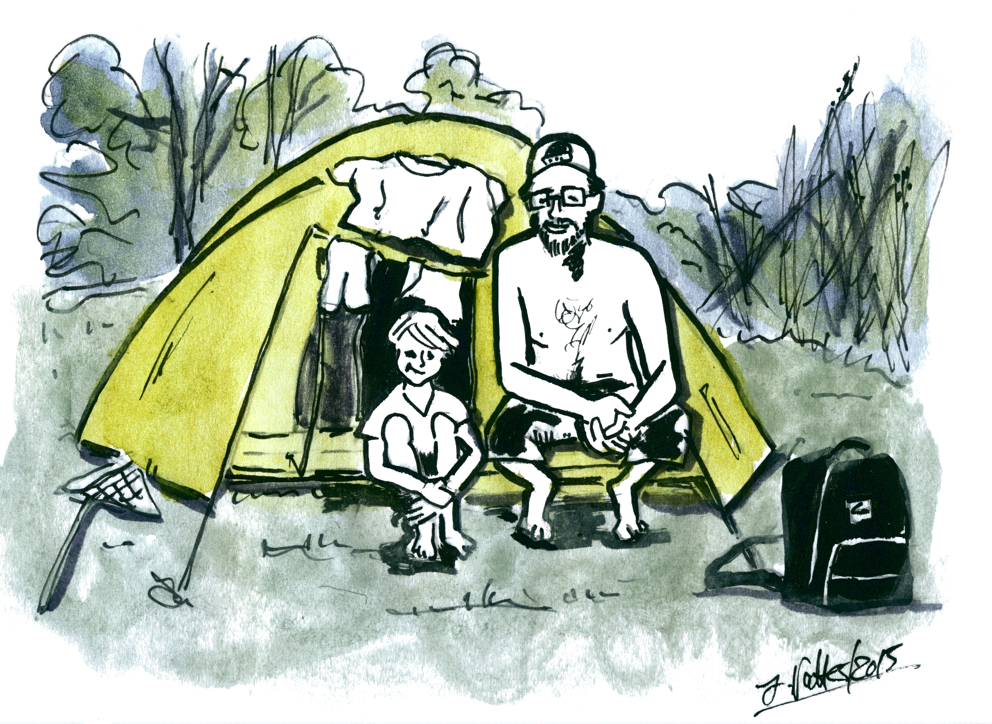 Mit Beginn der kühleren Tage verbringe ich wieder mehr Zeit in den Bude. Da kommt es auch schon mal vor, dass ich sogar meinen Arbeitstisch aufräume. Und siehe da. Da flattert dieses Foto von mir und meinen Sohn vom ersten gemeinsamen Zelten mir in die Hände. Nach dem Sommerende ist das wohl der erinnernde Hinweis, dass mir klar sein sollte, dass ich aufgrund der Elternzeit mit diversen Urlauben den längsten Sommer meines Lebens hinter mir habe. Die Erinnerung wandel ich doch glatt in eine Zeichnung um.
