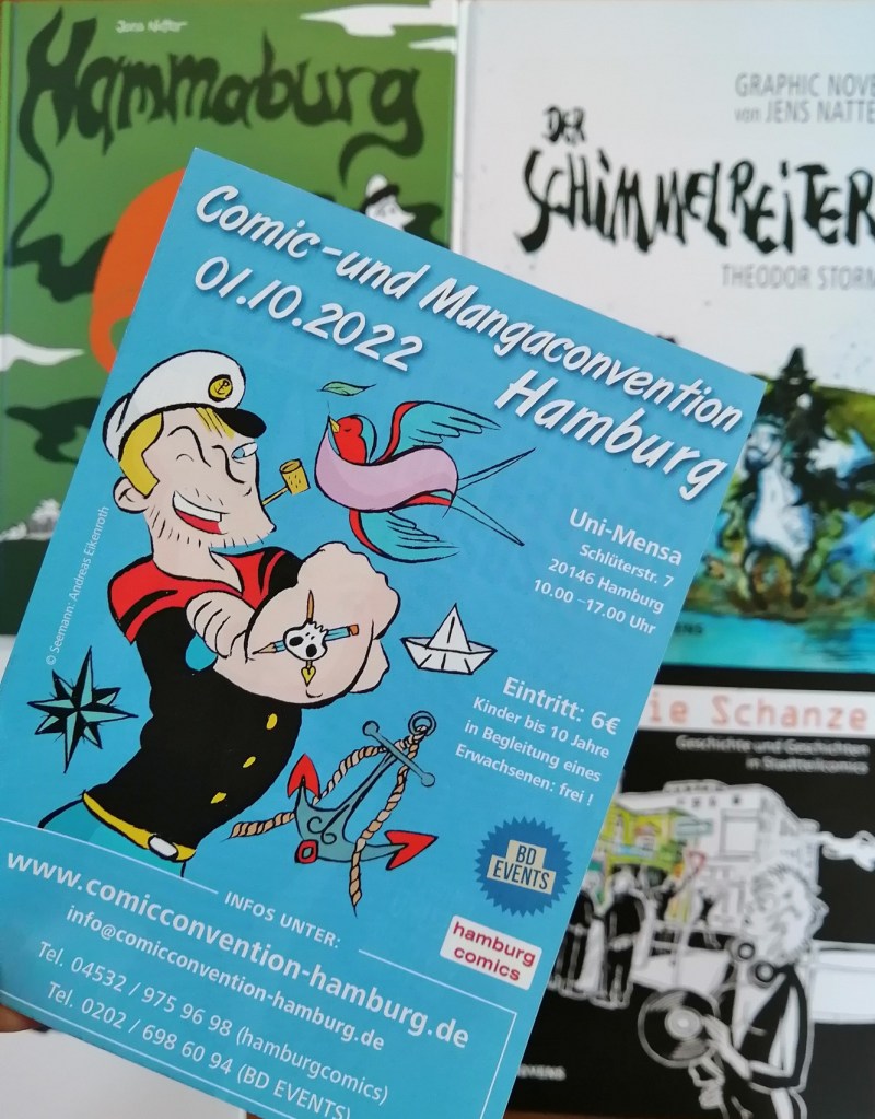 Hui, ich bin Special Guest auf der Comic-und Manga Convention Hamburg am 01.10.2022 von 10-17 Uhr in der Uni-Mensa. Mit im Gepäck sind natürlich meine Comicmachwerke wie Hammaburg oder die Schimmelreiter-Adaption , die Ihr Euch gerne signieren lassen könnt. und es gibt wieder die Chance , sich in 3 Min. ein lustiges Porträt an fertigen zu lassen. Schaut doch mal vorbei. https://www.comicconvention-hamburg.de/