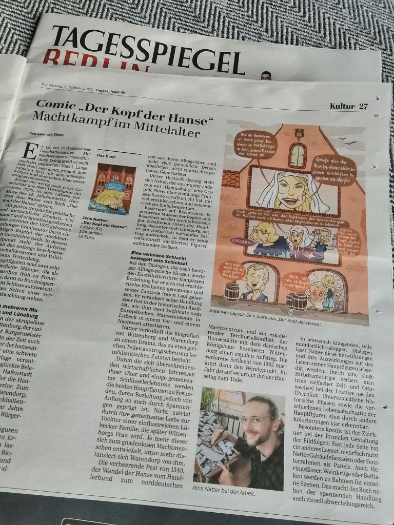 Kurz zuvor erschien bereits auf der bekannten Onlineplattform Comic.de und auf der Seite des Comicvertriebs PPM ein Interview von Michael Hüster mit mir über die Hintergründe der Geschichte. https://www.comic.de/2025/02/pest-kriege-handelsboykotte-jens-natters-geschichtscomic-der-kopf-der-hanse/