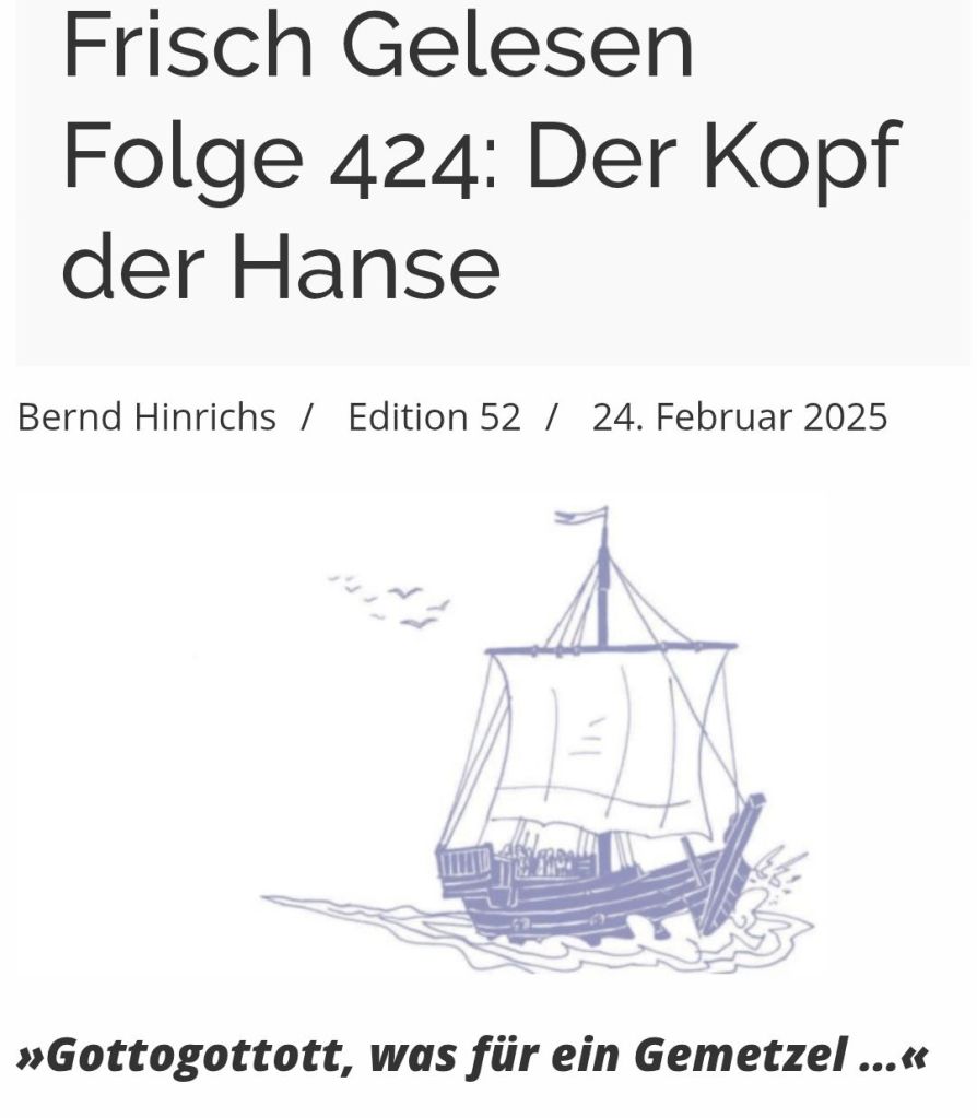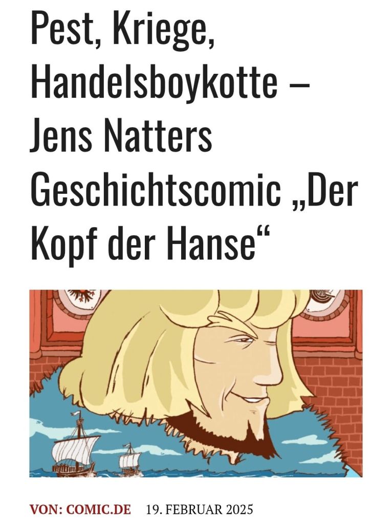 Kurz zuvor erschien bereits auf der bekannten Onlineplattform Comic.de und auf der Seite des Comicvertriebs PPM ein Interview von Michael Hüster mit mir über die Hintergründe der Geschichte. https://www.comic.de/2025/02/pest-kriege-handelsboykotte-jens-natters-geschichtscomic-der-kopf-der-hanse/
